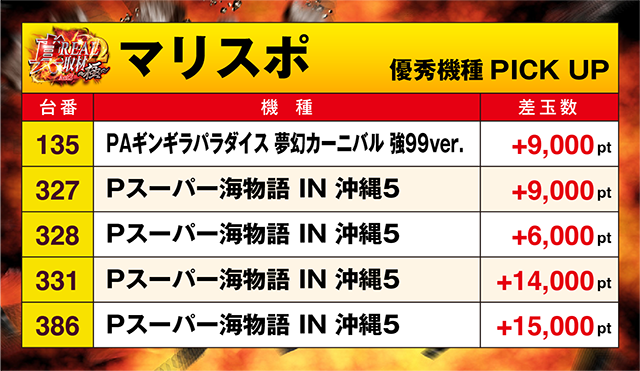 「Pスーパー海物語 IN 沖縄5」の386番台と331番台が+10,000ptオーバー!!