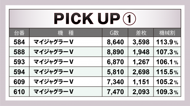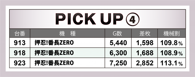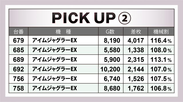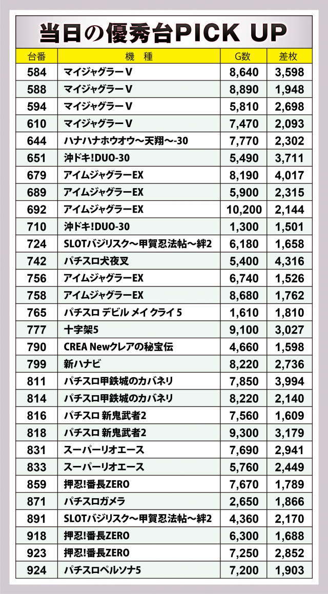 続いては好調4機種17台をチェック。この日はジャグラーシリーズ2機種に好調台が多数。どちらも6台トータルで+1万3千枚に迫ったが、『マイジャグラーⅤ』は+3千6百枚弱がトップ、『アイムジャグラーEX』は+4千枚突破台が筆頭となった。その他にも+4千枚弱の台を含む2台で+6千枚オーバーを記録した『パチスロ甲鉄城のカバネリ』、4台合計で+6千枚を超えた『押忍!番長ZERO』が好成績を収めた。