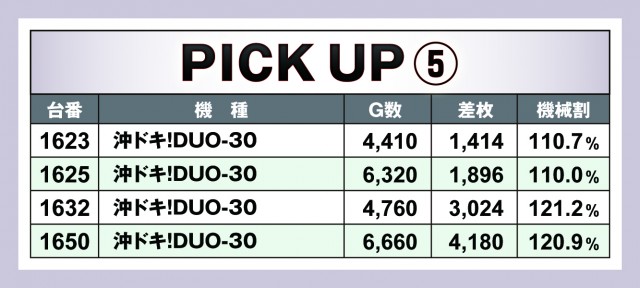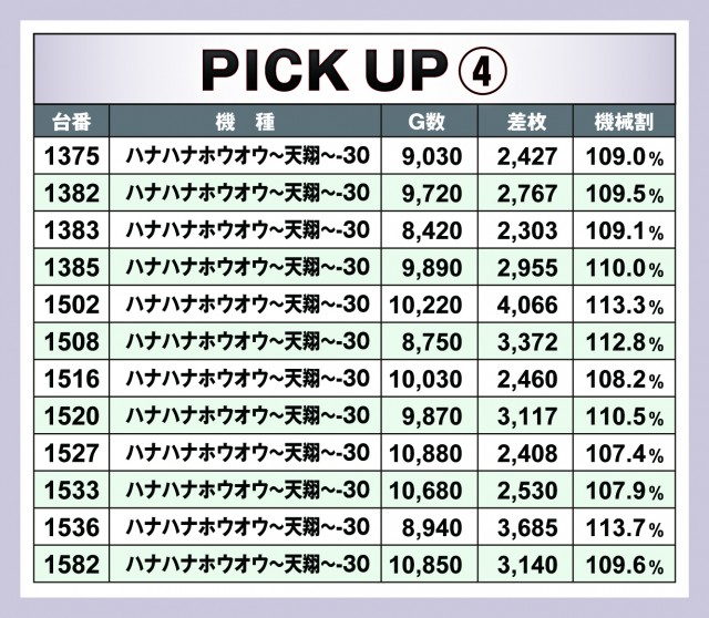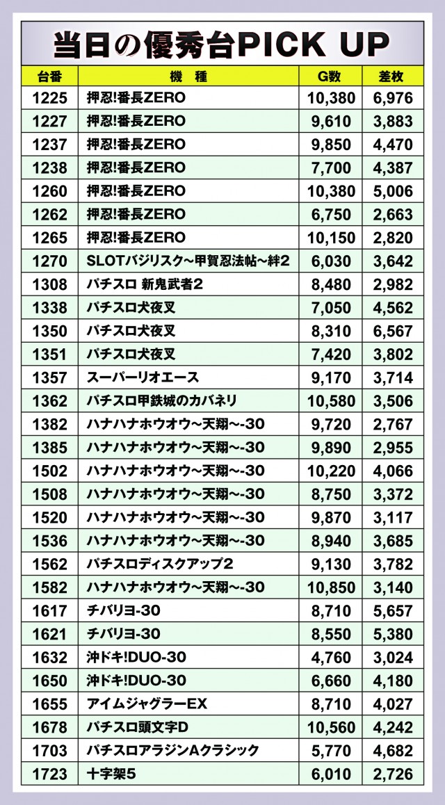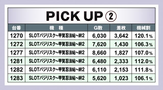 今回のピックアップは5箇所。差枚数順で紹介すると漏れてしまうが、実はプラス差枚数の台が多かったのが『SLOTバジリスク~甲賀忍法帖~絆2』だ。また、『ハナハナホウオウ~天翔~-30』の優秀台も列挙しておいたので、どこに高設定っぽい台が入ったのかを把握しておくと今後の立ち回りに活きてくるだろう。