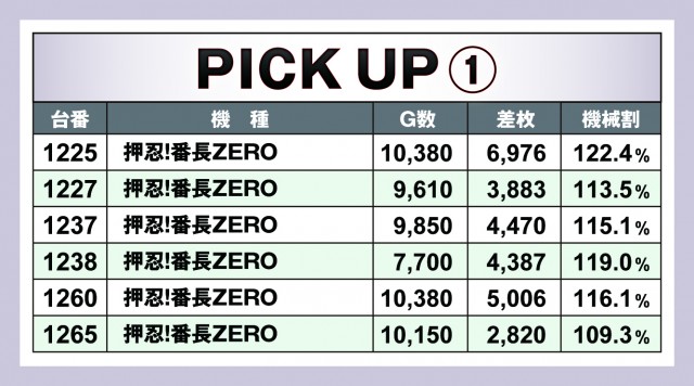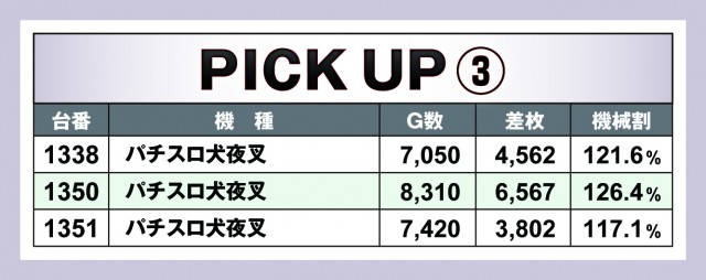 上表は今回の優秀台となっているが、『DAMZ竹尾インター本店』は午前9時よりの開店。ほぼ14時間営業なので、休みなく回せば1万ゲームを超えてくる。そして、そんな台がちらほら散見されているのだ。やはりそれは高設定と確信を持ってガチで回した結果なのだろう。人気機種の『押忍!番長ZERO』や『ハナハナホウオウ~天翔~-30』の優秀台にそれが見られた。一方で6.5号機の人気筆頭『パチスロ犬夜叉』も好調! 6台中3台が優秀台としてピックアップされている。もしかしたら半分が高設定だったのかもしれない。