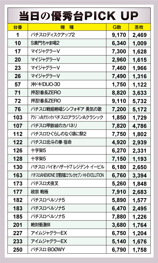 また上表でピックアップしているが、定番の『マイジャグラーV』からは多くの優秀台が生まれ、さらに『押忍!番長ZERO』からも5千枚オーバーの大台を突破する台が出現。また注目の6.5号機からは、『パチスロペルソナ5』コーナーが大盛り上がりとなっていたぞ!