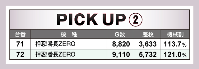 まずは優秀台PICK UPから見ていきたいが、なんと言ってもズラリと並んだ人気機種に注目だ! 『パチスロ戦姫絶唱シンフォギア 勇気の歌』は5千枚オーバーのプラス差枚を獲得。また『パチスロ甲鉄城のカバネリ』は4千枚オーバー、『パチスロANEMONE 交響詩篇エウレカセブン HIーEVOLUTION』からは3千枚オーバーが出現するなど、ホール内の様々な機種が大活躍となった。