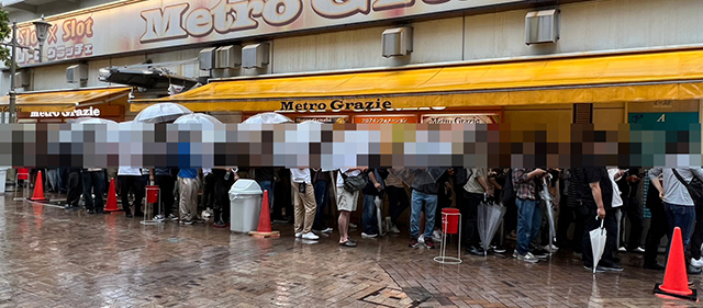 前回の「英雄の軌跡」では見事な勝利を飾った「メトログラッチェ スロット専門店」。約1ヶ月ぶりの実施となる今回は、生憎の雨にもかかわらず朝から80人ものファンが列を成していた。それだけ同ホールへの期待が高いということか。今回も素晴らしい勝利が期待できそうだ! それでは早速、その一部始終をご覧いただこう。