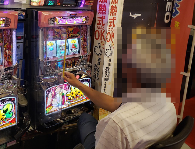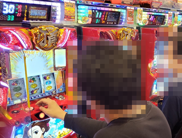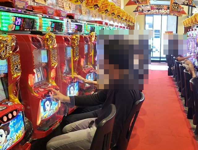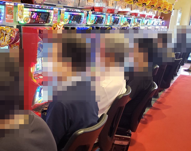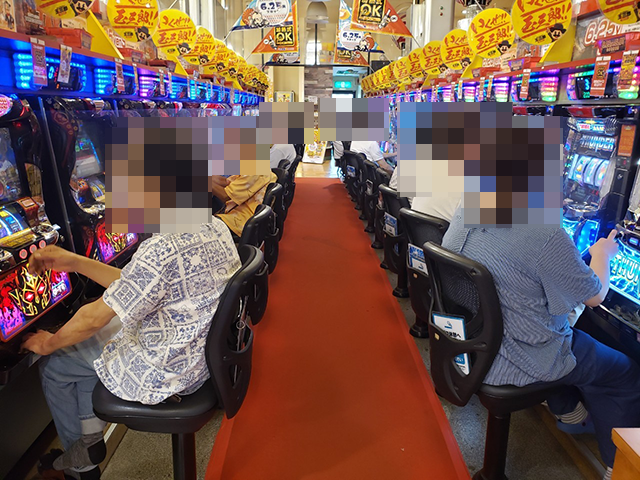 いくつもの機種に、遊技を満喫しているような姿があった「パチンコ玉三郎竹尾店」。