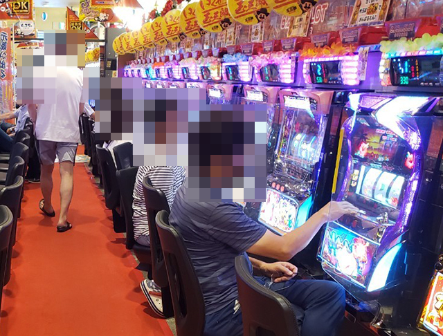 パチスロのシマをみてみると、あちこちに笑顔で遊技をおこなっている姿があった。