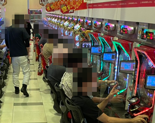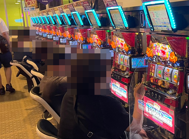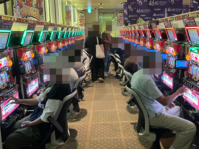 ジャグラーシリーズ全体でみてもひときわ人気があり、にぎわいも大きい。じっくりと遊技を楽しんでいる姿からも、期待の大きさが感じられた。