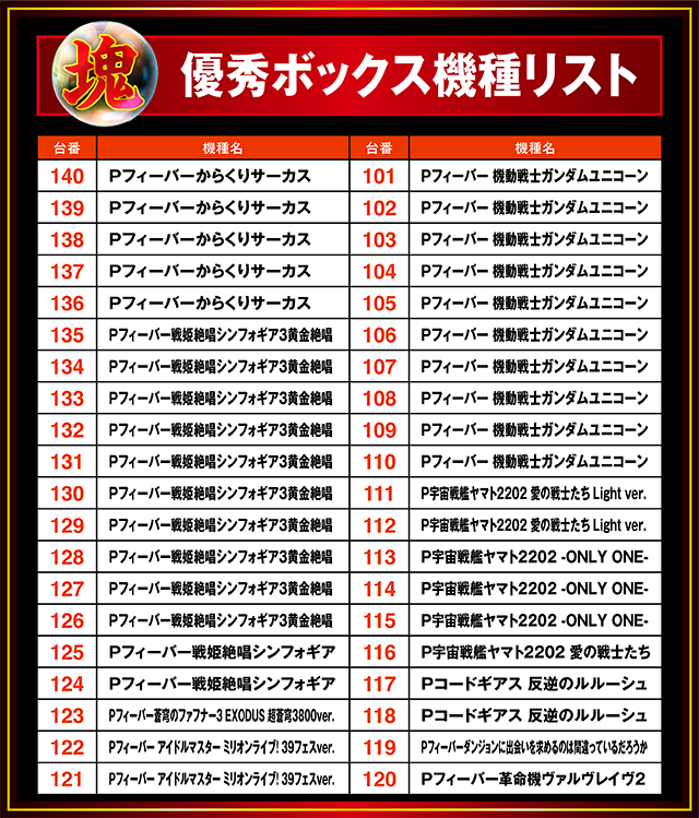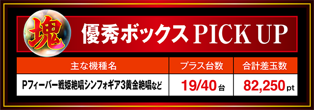 新台の「Pフィーバー戦姫絶唱シンフォギア3黄金絶唱」と「Pフィーバー 機動戦士ガンダムユニコーン」、「Pフィーバー アイドルマスター ミリオンライブ! 39フェスver.」の3機種が、機種トータルで+10,000ptを超えた。