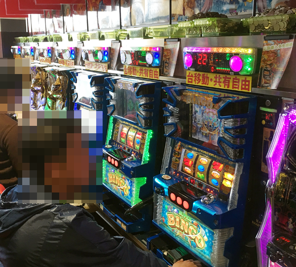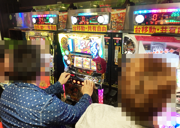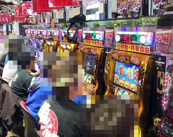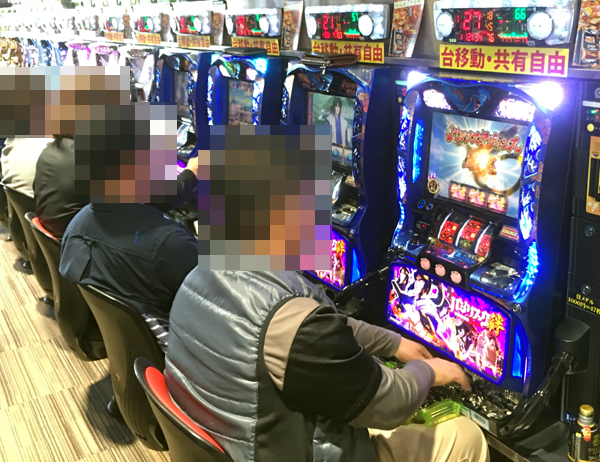 昼以降の様子をみてみると、1000円/47枚パチスロでは「バジリスク〜甲賀忍法帖〜絆」や「ミリオンゴッド-神々の凱旋-」、「押忍!サラリーマン番長」が大盛況。