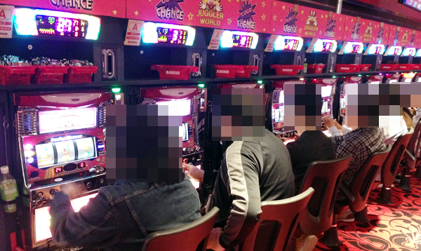 ジャグラーシリーズを中心としたボーナスタイプでも楽しそうな笑顔をみせるプレイヤーが多く、にぎやかな状況となっていた。
