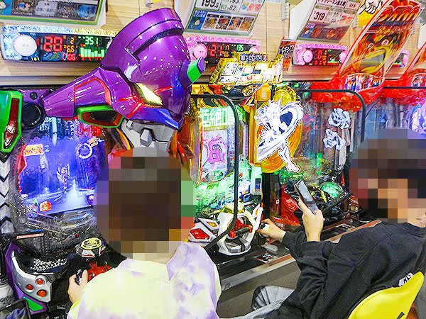 15時ごろの200円/89玉パチンコを見てみると「新世紀エヴァンゲリオン〜未来への咆哮〜」や「Pフィーバー戦姫絶唱シンフォギア3黄金絶唱」が活況。プレイヤーの満足そうな表情から、充実した時間を過ごしていたことがうかがえる。