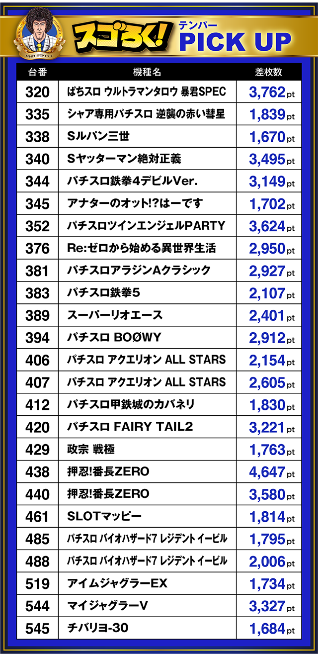 320番台の「ぱちスロ ウルトラマンタロウ 暴君SPEC」や352番台の「パチスロツインエンジェルPARTY」、420番台の「パチスロ FAIRY TAIL2」なども3,000ptオーバー!!