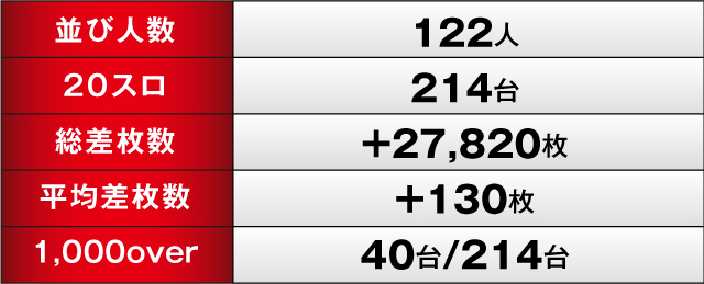 前々回は+4万枚オーバー、前回は3万枚オーバーと連続の大幅プラスに続き、今回も+27,820枚プラスの快勝での終了となった。とくにジャグラーシリーズの活躍が目覚ましく、朝から積極的に狙う価値は十分にあるといれるだろう。またジャグラーシリーズ以外にも、「押忍!番長ZERO」「SLOTバジリスク~甲賀忍法帖~絆2」などの状況が良いAT・ART機も複数機種あったので、十分に楽しめる環境は整えてあっただけに、次回実施予定の9月18日も期待できると思うので、豊岡エリアのファンの人はぜひ注目していただきたい!