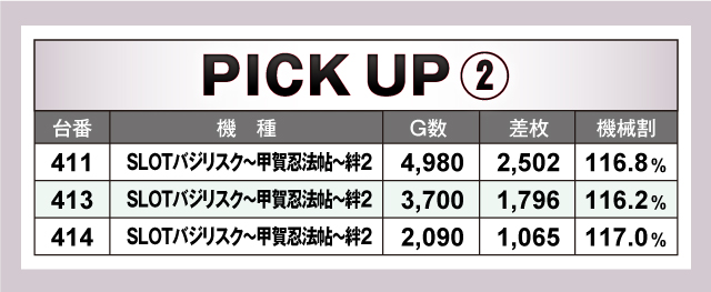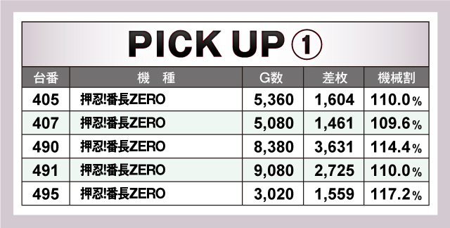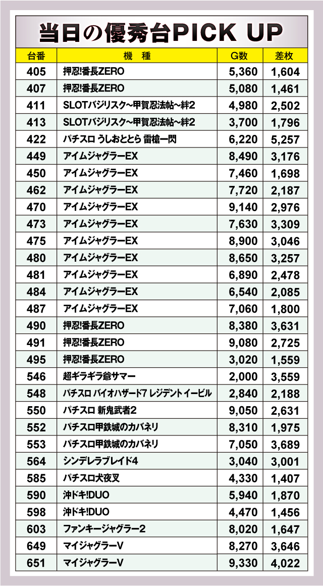 まずは優秀台を見てほしい。軒並み高ポイントばかりだが、最も高い差枚数だったのは、422番台の「パチスロ うしおととら 雷槍一閃」で5,422枚という見事な結果だった。また、3,000枚オーバーの台も11台あることからも、しっかりと好状況が用意されていたことが窺える。また、機種として注目してほしい「押忍!番長ZERO」「SLOTバジリスク~甲賀忍法帖~絆2」「アイムジャグラーEX」の3機種は、下記にて紹介していくので要チェック!