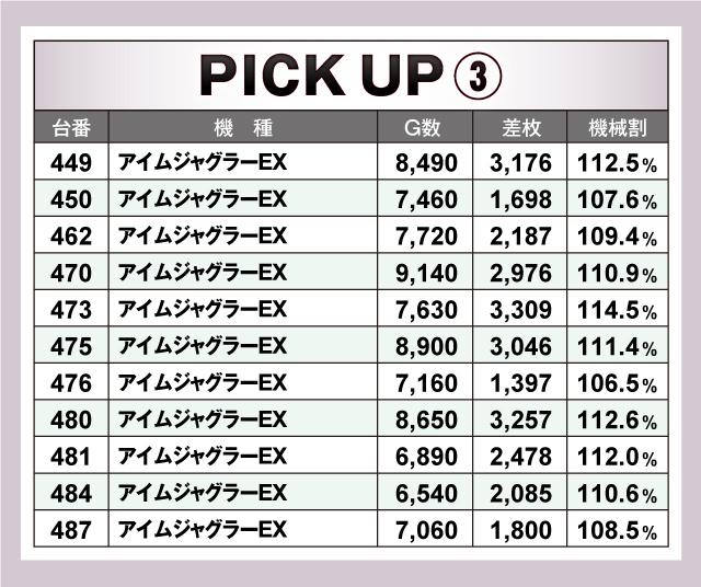 さて、注目してほしい3機種「押忍!番長ZERO」「SLOTバジリスク~甲賀忍法帖~絆2」「アイムジャグラーEX」は、どれも優勝な結果を残していたが、やはり同店の特徴が色濃く出ているのは「アイムジャグラーEX」だろう。今回も1,000枚オーバーの台が続出し、3,000枚も複数台あった。また回転数も申し分ないことから、同店のジャグラーの強さは、ユーザーにも周知されていることが分かるだろう!
