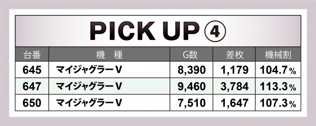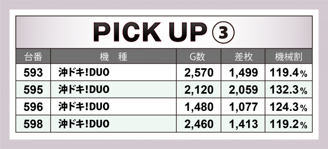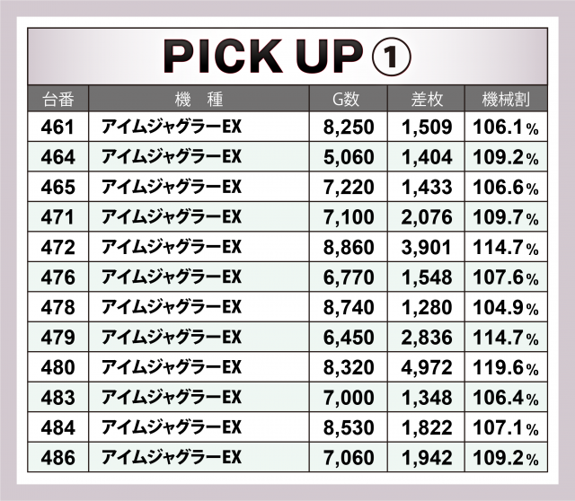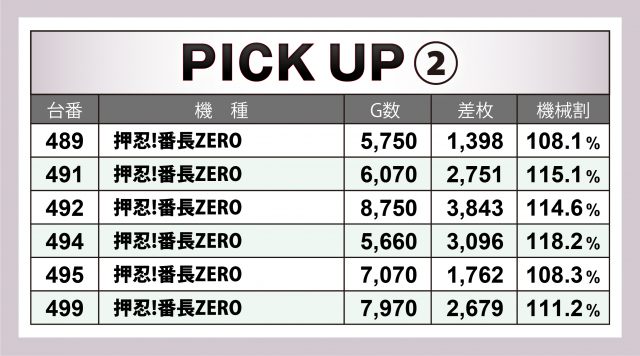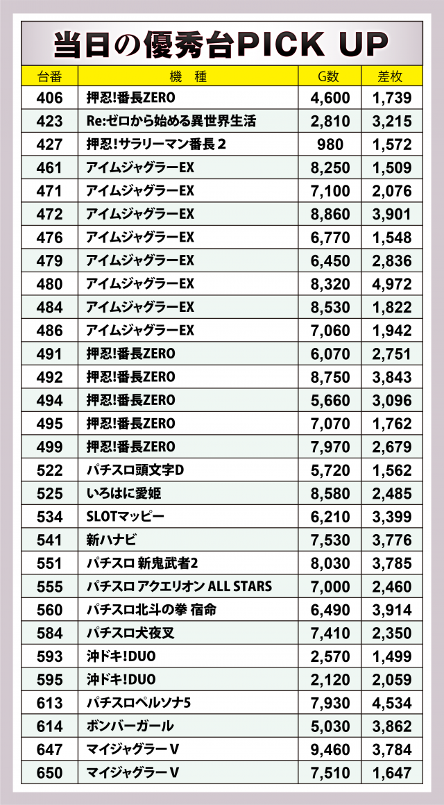 続いては当日好調だった4機種について。圧巻だったのが12台全てが4桁プラスとなった『アイムジャグラーEX』で、+5千枚弱の台をトップに12台の合計は+2万6千枚超をマーク。さらには+3千枚超が2台&6台トータルで+1万5千枚を記録した『押忍!番長ZERO』の好成績が光った。