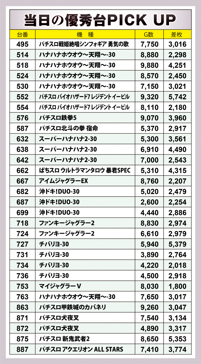 まずは優秀30台のPICK UPから。30台のうち1台を除く29台が差枚数+2千枚以上、+3千枚以上は15台、+4千枚オーバーは6台となった。後述する好調4機種以外では、共に+5千枚オーバーを記録した『パチスロ バイオハザード7 レジデント イービル』『パチスロ 新鬼武者2』、+4千枚を突破した『ぱちスロ ウルトラマンタロウ 暴君SPEC』といったハイスコアが光った。
