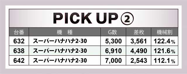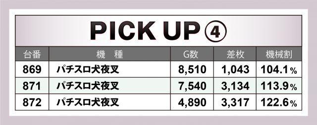 続いては当日好調だった4機種17台にズームイン。この日は3機種の30パイマシンが好記録を連発。+4千枚超の台を筆頭に6台トータルで+1万5千枚近くをマークした『ハナハナホウオウ~天翔~-30』に加え、+4千枚台をトップに3台合計で+1万枚突破の『スーパーハナハナ2-30』、+5千枚台が最高で5台合わせて+1万4千枚オーバーを叩き出した『チバリヨ-30』の好調が際立った。さらには導入間もない『パチスロ犬夜叉』が3台合算で+7千枚をクリアした。