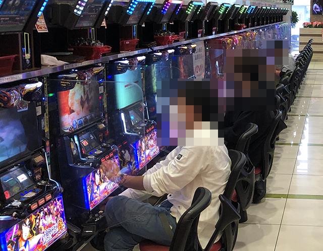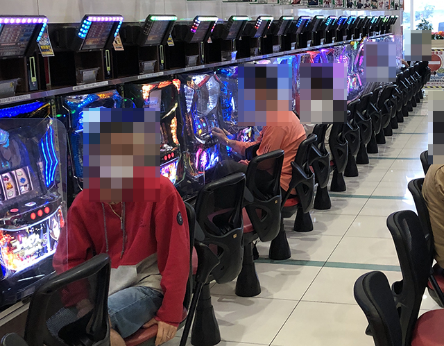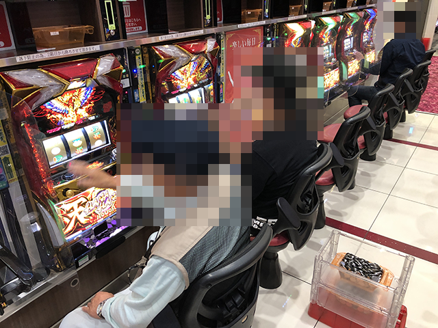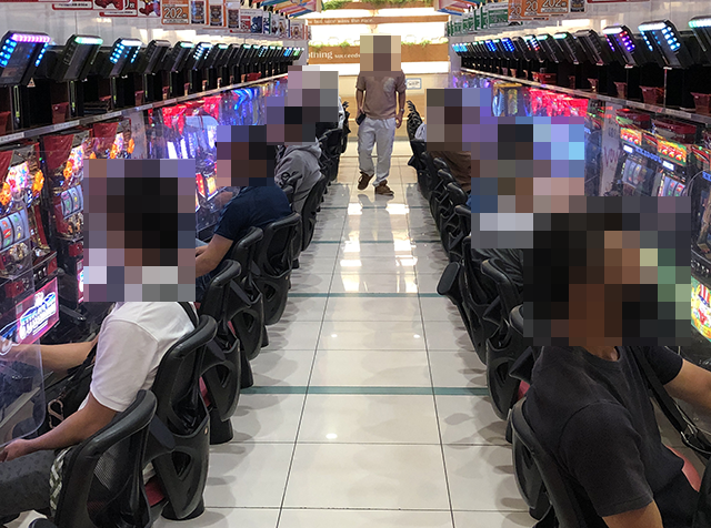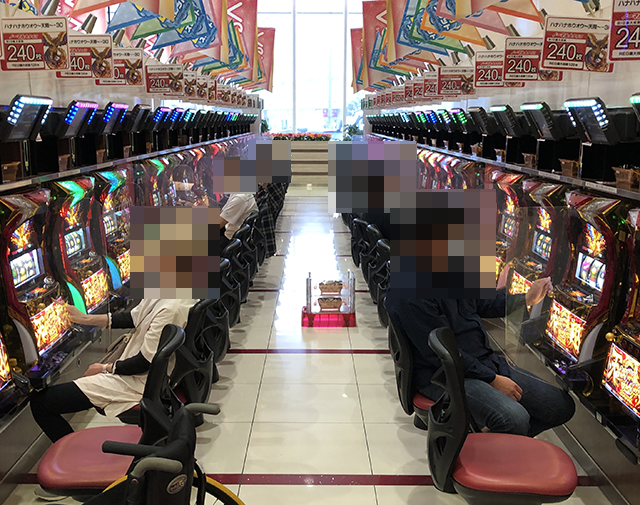 夕方頃にパチスロのシマをみてみると、さまざまな機種に楽しげな光景が広がっていた。
