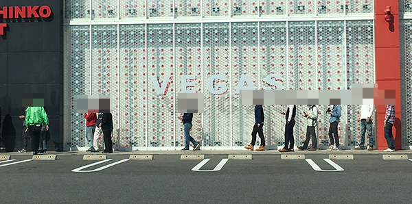 朝イチはパチスロに注目が集まっており、「沖ドキ!-30」やハナハナシリーズが早くから盛況。