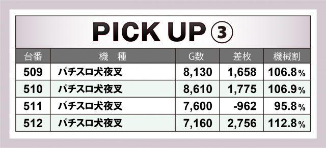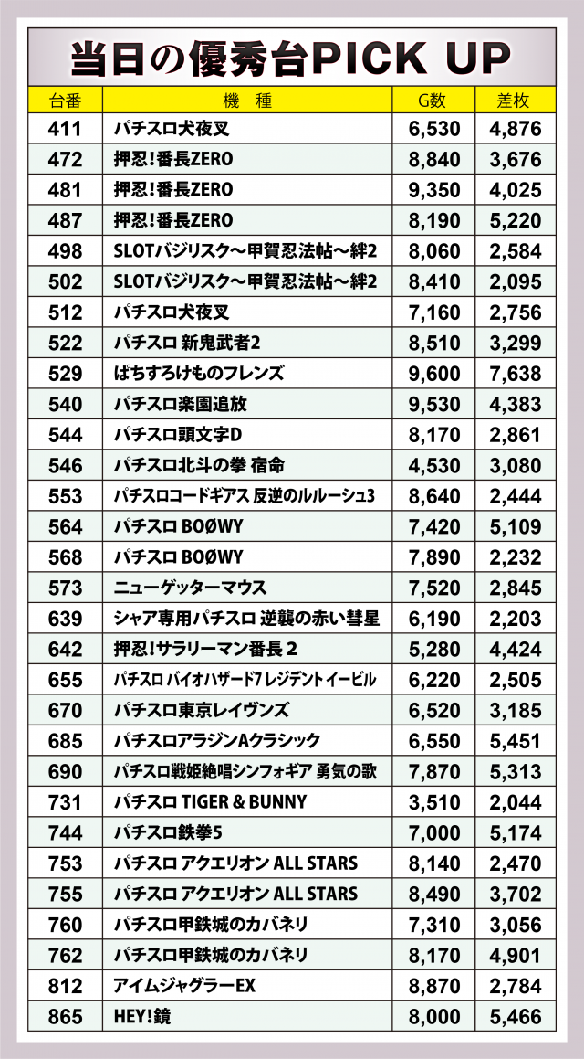 まずは優秀30台のPICK UPから。この日は30台全てが差枚数+2千枚以上を達成、+3千枚以上は18台、+4千枚オーバーは11台、+5千枚オーバーは7台とかなりの優秀度に。後述する横並び好況スポット以外では、新台導入間もないが+5千枚突破台を筆頭にドル箱の数々が目立った『パチスロ BOØWY』、+5千枚弱の台と合わせて2台で+8千枚超となった『パチスロ甲鉄城のカバネリ』の成績が光った。また『パチスロアラジンAクラシック』『パチスロ鉄拳5』『HEY!鏡』がそれぞれ+5千枚を突破した。
