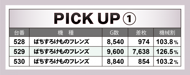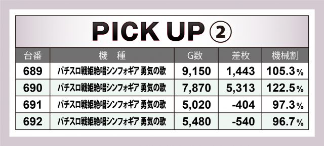 続いては5箇所の横並び好況スポットについて。まず注目は3台全てがプラス&トップが+7千枚突破の『ぱちすろけものフレンズ』。次いで+5千枚オーバー台が生じた『パチスロ戦姫絶唱シンフォギア 勇気の歌』、横並び4台の中に+4千枚台&それ以外の箇所でも+5千枚超の台でドル箱の山を築いた『押忍!番長ZERO』の活躍が際立った。
