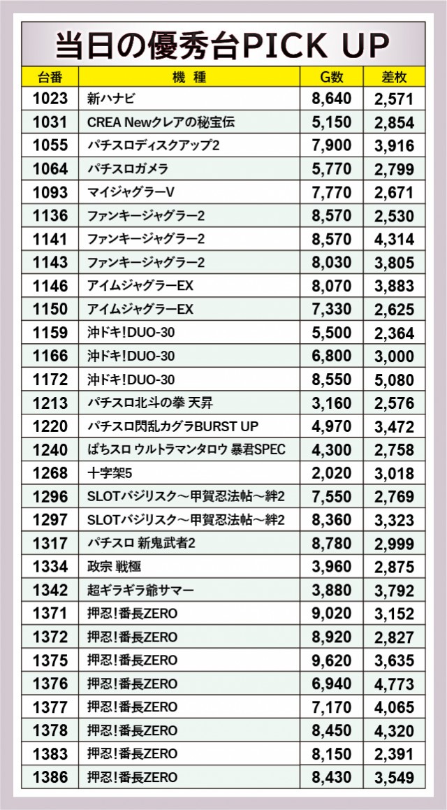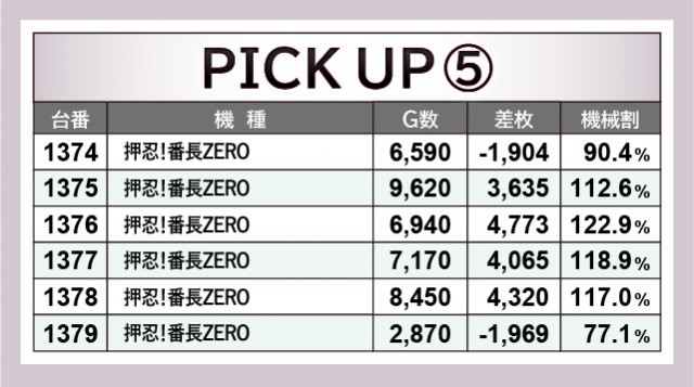 時代が6.5号機へと移り行くなか、『押忍!番長ZERO』はまだまだ現役バリバリの活躍を見せていた。1374~1379番台の横並び好況スポットでは、4,773枚・4,065枚・4,320枚と、3台連続で4千枚OVERを記録する圧巻の光景を形成。残念ながらマイナスを記録した台があるものの、凄まじい熱気を放つ状況にファンも確信を得ていたのではないだろうか。