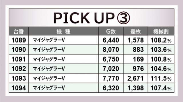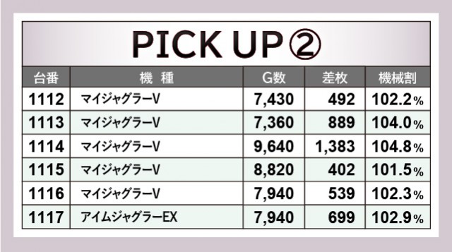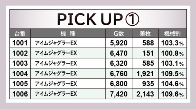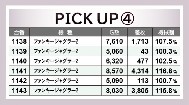 『ジャグラー』シリーズにおいて、4箇所の6台横並びスポットを確認できた。いずれプラス差枚を記録しており、回転数と差枚数が比例した数字から、コンスタントなボーナス当選が窺えるだろう。その中でひと際存在感を放っていた『ファンキージャグラー2』では、1141番台+4,314枚・1143番台+3,805枚という目覚ましい記録が生まれ、ファンに笑顔をもたらしていた。