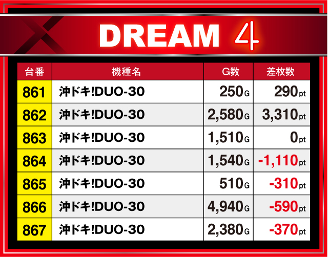 ナ:メインの『沖ドキ!DUO-30』も気になるところがありました。4/7でマイナスですが、これまでは2回目・4回目と定期的に注目されていた機種なので覚えておいて損はないかと思います。