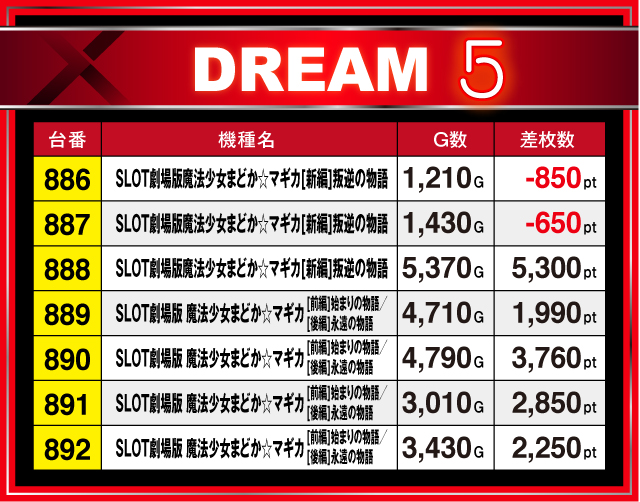 ナ:『SLOT劇場版魔法少女まどか☆マギカ[新編]叛逆の物語』と『SLOT劇場版 魔法少女まどか☆マギカ[前編]始まりの物語/[後編]永遠の物語』が機種またぎで結果が出ています。こちらは前編後編は4/4でプラス。叛逆は1/3ですが、1台は5千枚オーバーと下では考えられない結果となっています。