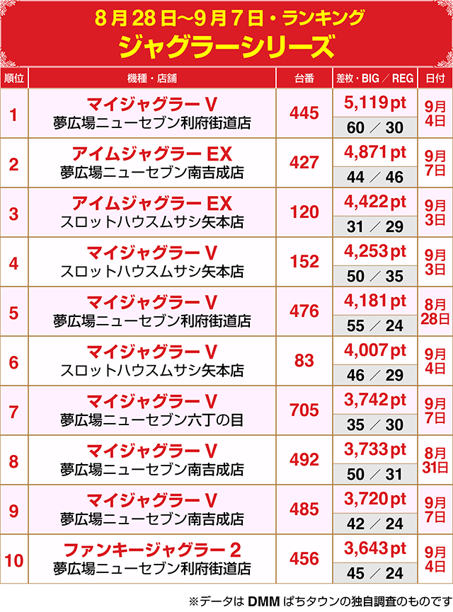 +5,000ptオーバーで、『マイジャグラーV』が堂々の1位を獲得!