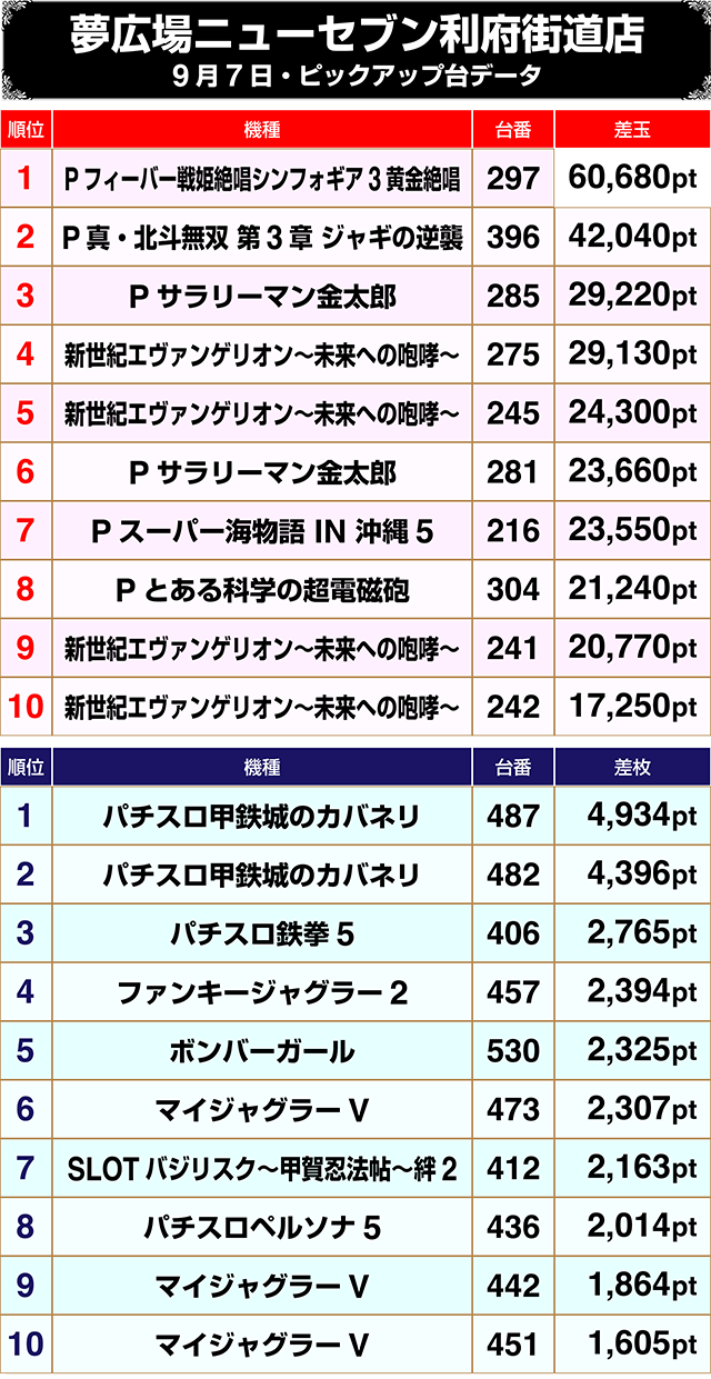 新機種の『Pフィーバー戦姫絶唱シンフォギア3黄金絶唱』は、297番台が+60,680ptで首位。