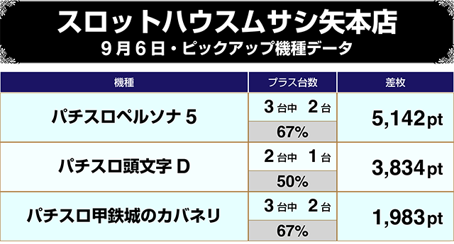 『パチスロ甲鉄城のカバネリ』、新台の『パチスロペルソナ5』はともに3台中2台がプラス!