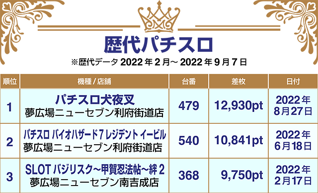 全台プラスの『パチスロ 新鬼武者2』や+10,000ptを超えた『パチスロ犬夜叉』など、多数の機種でプレイヤーたちの活躍が目立った。