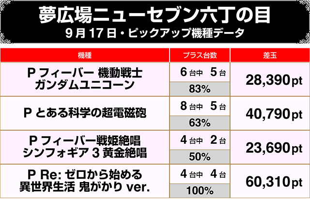 『Pフィーバー 機動戦士ガンダムユニコーン』にも魅力的なデータが多く、6台中5台がプラス。