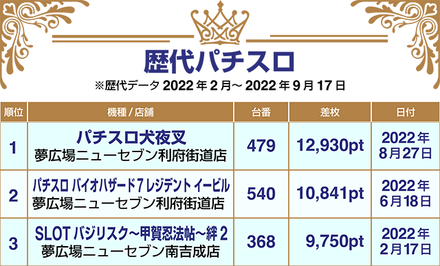 『沖ドキ!DUO』や『パチスロ甲鉄城のカバネリ』など、幅広い導入時期の機種が好記録を残した。