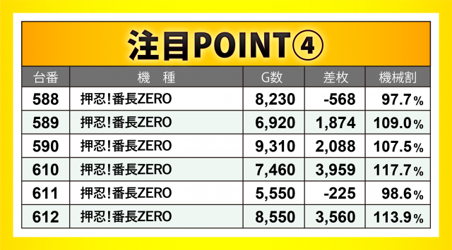 『押忍!番長ZERO』は6台中4台がプラス、+3千5百枚超を記録したのが2台の中、全台トータルでは+1万1千枚オーバーを達成した。