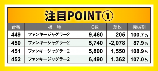 まずはジャグラーシリーズ2機種に注目。『ファンキージャグラー2』は突出した差枚数の台がなかったものの4台中3台がプラスと高水準の結果に。