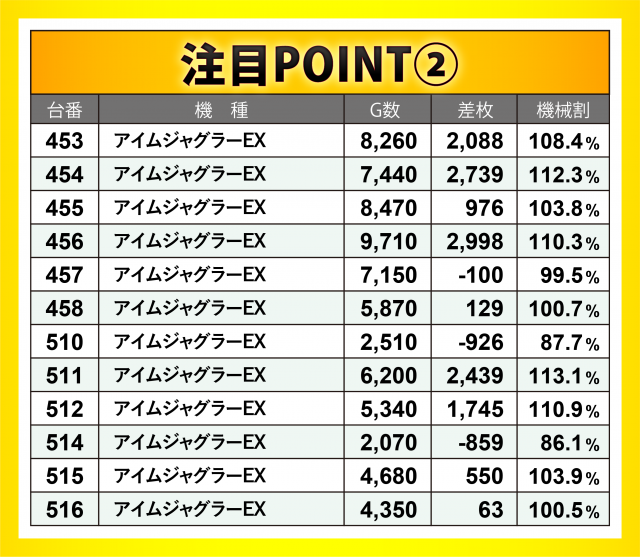 次いで『ファンキー』よりも設置台数の多い『アイムジャグラーEX』は全12台で計+1万2千枚弱をマーク、+3千枚近いスコアが2台となった。