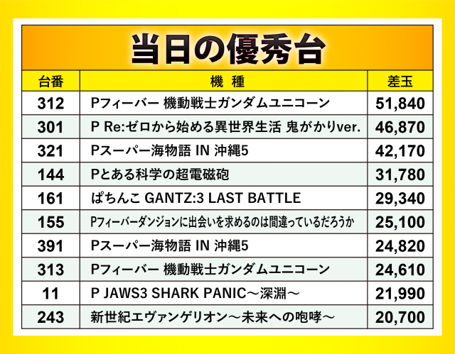 この日、最も高い差玉を残したのが『Pフィーバー 機動戦士ガンダムユニコーン』。+5万1千発オーバーという立派な成績を残し、他には+2万4千発オーバー台がランクイン。