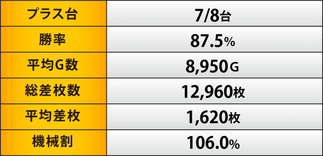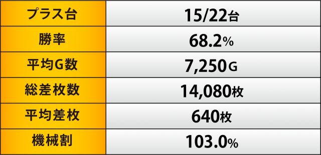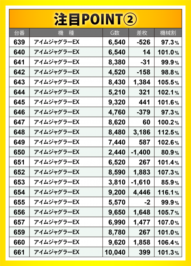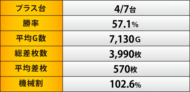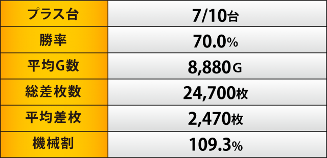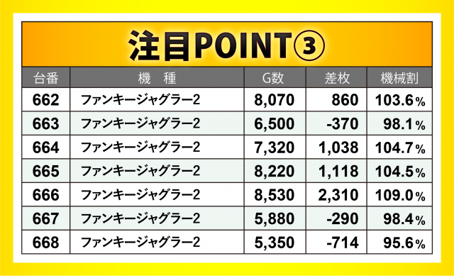 3機種中最も設置の少ない『ファンキージャグラー2』はプラス率は低めだったが、666番台の+2,310枚がトップ成績だった。
