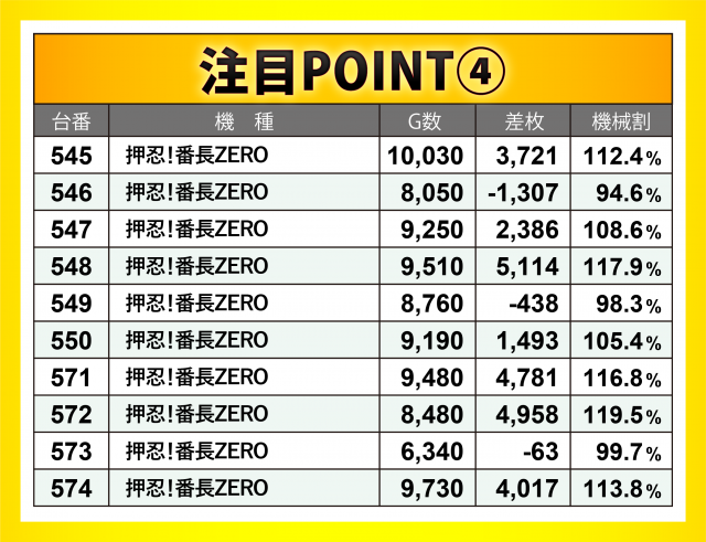 また定番人気の『押忍!番長ZERO』は全体の7割がプラス、+5千枚オーバー台を筆頭に10台の合計は+2万枚オーバー、1台あたり平均+2千4百枚を成し遂げた。