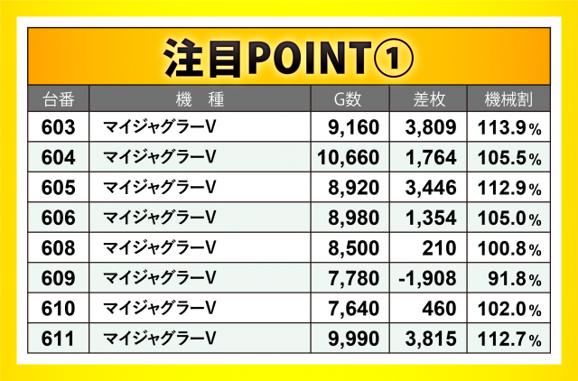 まずはジャグラーシリーズ3機種から。『マイジャグラーⅤ』は8台中7台がプラス、2台が+4千枚弱を叩き出す中、トータルで+1万3千枚弱を達成。
