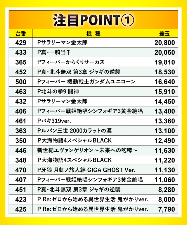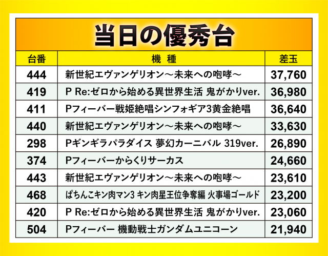 その他7台は全て異なる機種だったが、『エヴァ15』を含み上位4機種までが+3万発超の記録を樹立した。さらに10位までが+2万発オーバーに!