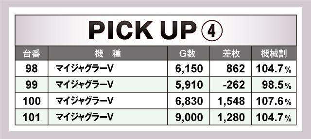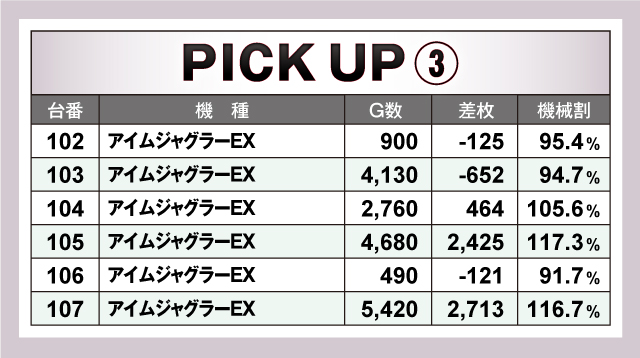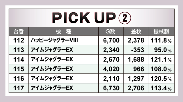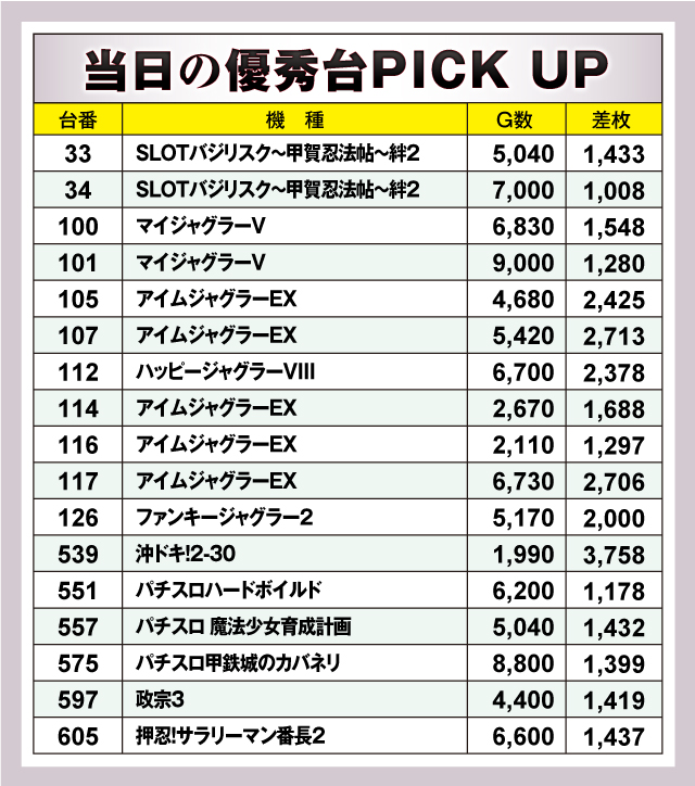まずは優秀台の紹介から。特に目立ったのはジャグラーシリーズで、ピックアップ台の半数以上がジャグラーシリーズだったことからも、しっかりと力を入れていることが窺える。その他は「SLOTバジリスク〜甲賀忍法帖〜絆2」や「パチスロ甲鉄城のカバネリ」など人気機種や6.5号機が好記録を出していた!