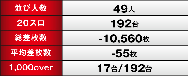 総差枚は残念ながらマイナスとなったが、ジャグラーシリーズや人気機種を中心にしっかり楽しめる内容は準備されていた様子。また並びでの盛り上がりや、あまり回されていない台にもチャンスが隠されていた可能性は高いので、次回実施時は店内全体を見回して探してみることをオススメするぞ!