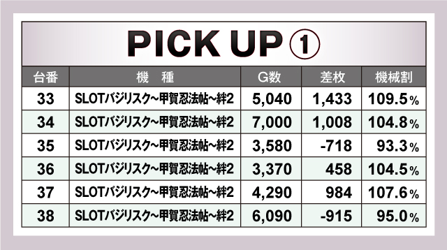 続いては並びで賑わっていた箇所をピックアップ。先ほど紹介した通り、ジャグラーシリーズが好調で、ピックアップした4つのうち3つがランクイン。結果を見ても、しっかりと回された台が多くあったことからも、状況は良かった可能性が高そうだ。また、「SLOTバジリスク〜甲賀忍法帖〜絆2」には6台並びで良かった箇所があり、4/6台がプラス終了。あまり回されていない台もあったので、次回は好調台の隣に注目しても良いかもしれないぞ!