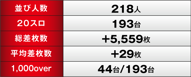 終わってみれば、優秀台、ピックアップ機種の活躍もあり、トータルの差枚数では+5,559枚を記録。1,000over台も44台/193台と上々の成績を残した。これでまた、ファンの信頼は大きく、強くなっていく。次回以降も目が馳せなくなりそうだ。