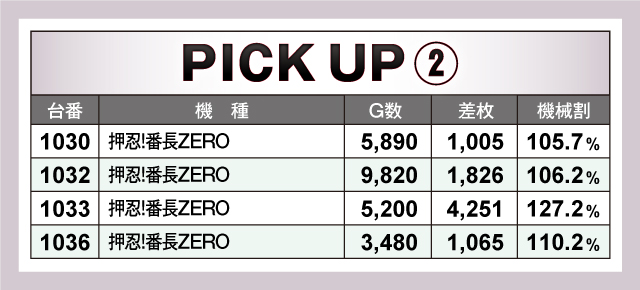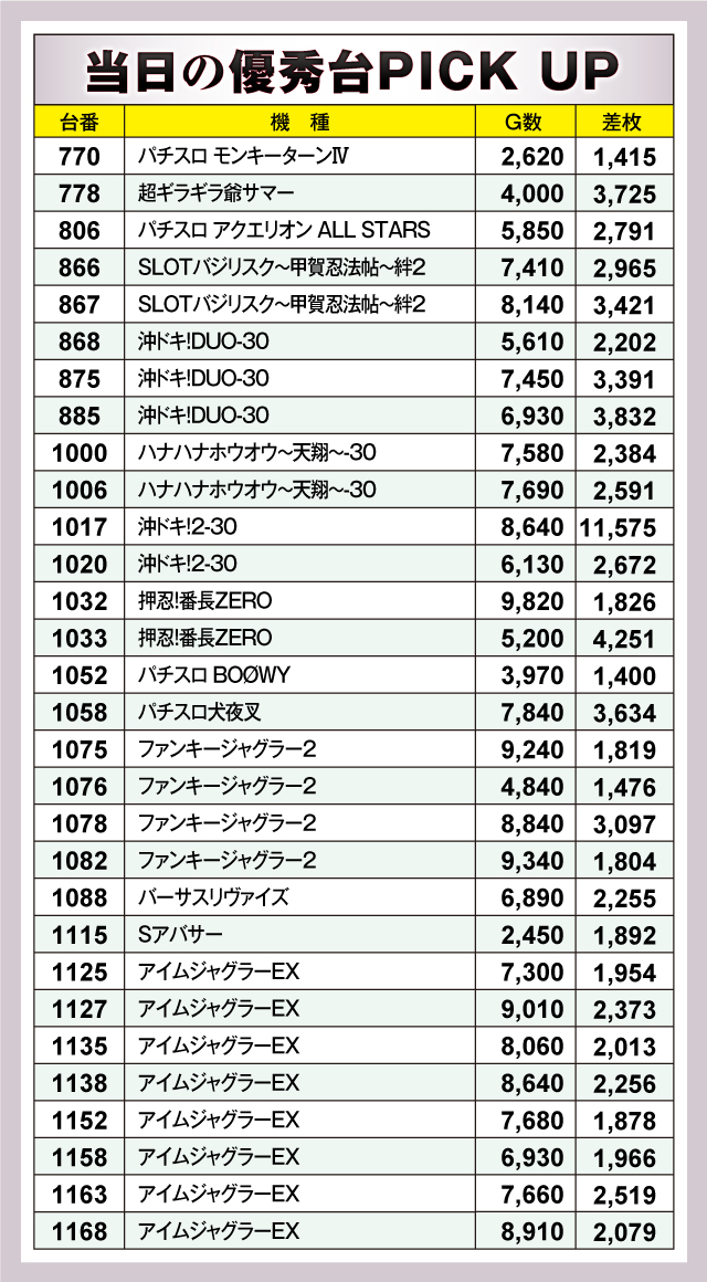 優秀台を見てみると、なんといっても+11,575枚を記録した『沖ドキ!2-30』の1017番台が燦然と輝く。ここ最近の「ヒーローズレポート」でも珍しい大台突破に、店中が沸いたのは言うまでもない。これに次ぐ成績を残したのが+4,251枚の『押忍!番長ZERO』の1033番台。これとて、かなりの出玉なのだが、やはり大台の前には少々物足りなくさえある。以下、+6,832枚の『沖ドキ!DUO-30』885番台、+3,391枚の同875番台、+3,725枚の『超ギラギラ爺サマー』778番台、+3,634枚の『パチスロ犬夜叉』1058番台、+3,421枚の『SLOTバジリスク〜甲賀忍法帖〜絆2』867番台と続いた。