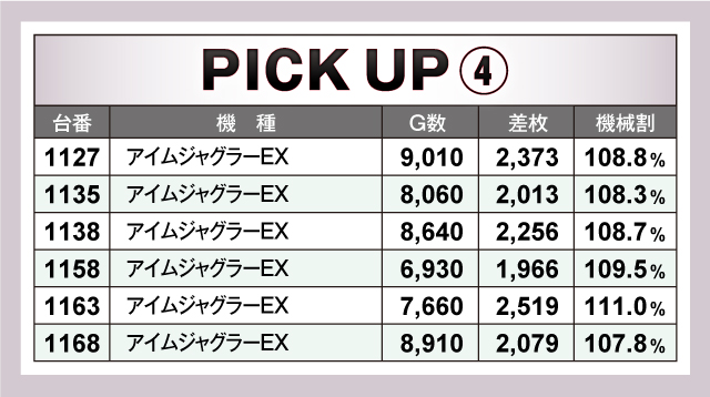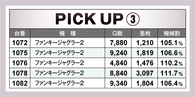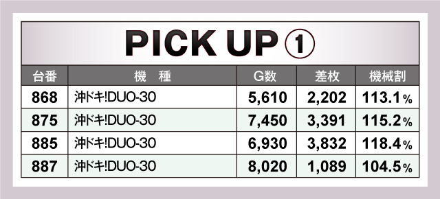 ピックアップ機種では、優秀台で名の挙がった『沖ドキ!DUO-30』、『押忍!番長ZERO』の他、『ファンキージャグラー2』、『アイムジャグラーEX』が盛り上がりを見せていた。