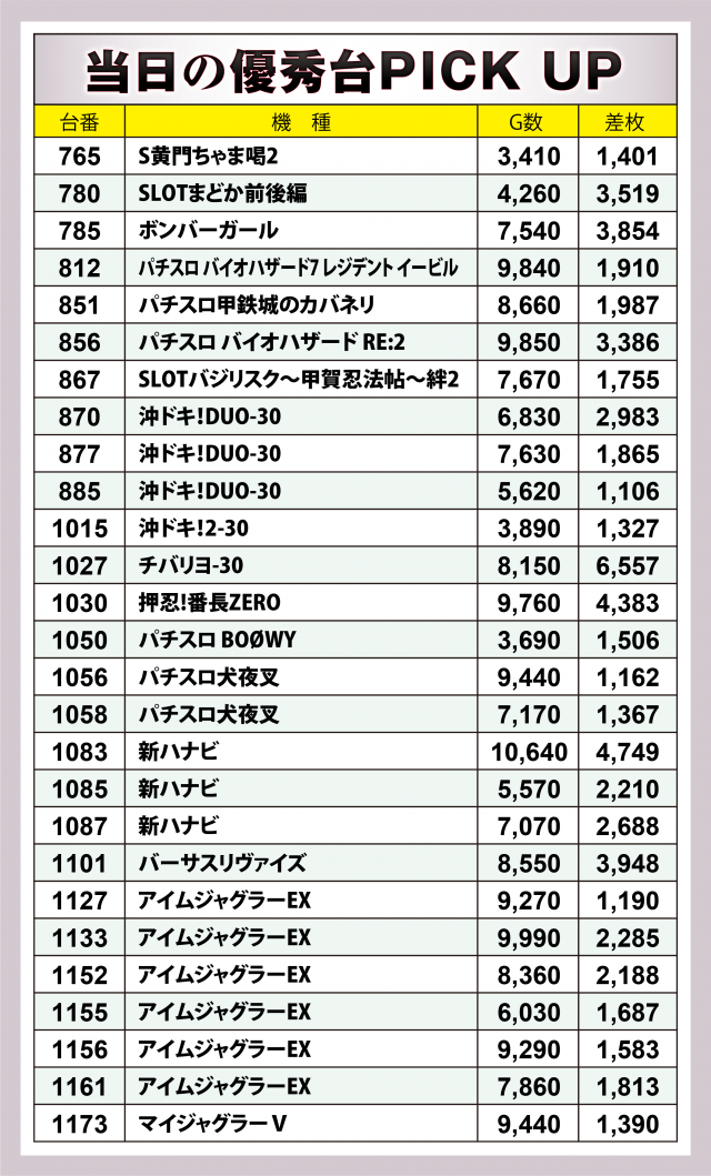 まずは優秀27台のPICK UPから。定例では上位30台を取り上げるのだがそこに満たなかったのが些か残念。うち12台が差枚数+2千枚以上を達成、+3千枚以上は7台、+4千枚オーバーは3台となった。後述する好調マシン3機種以外では、+6千5百枚オーバーを記録した『チバリヨ-30』、+4千枚を突破した『押忍!番長ZERO』、共に+3千枚をクリアした『ボンバーガール』『パチスロ バイオハザード RE:2』『バーサスリヴァイズ』のスコアが光った。